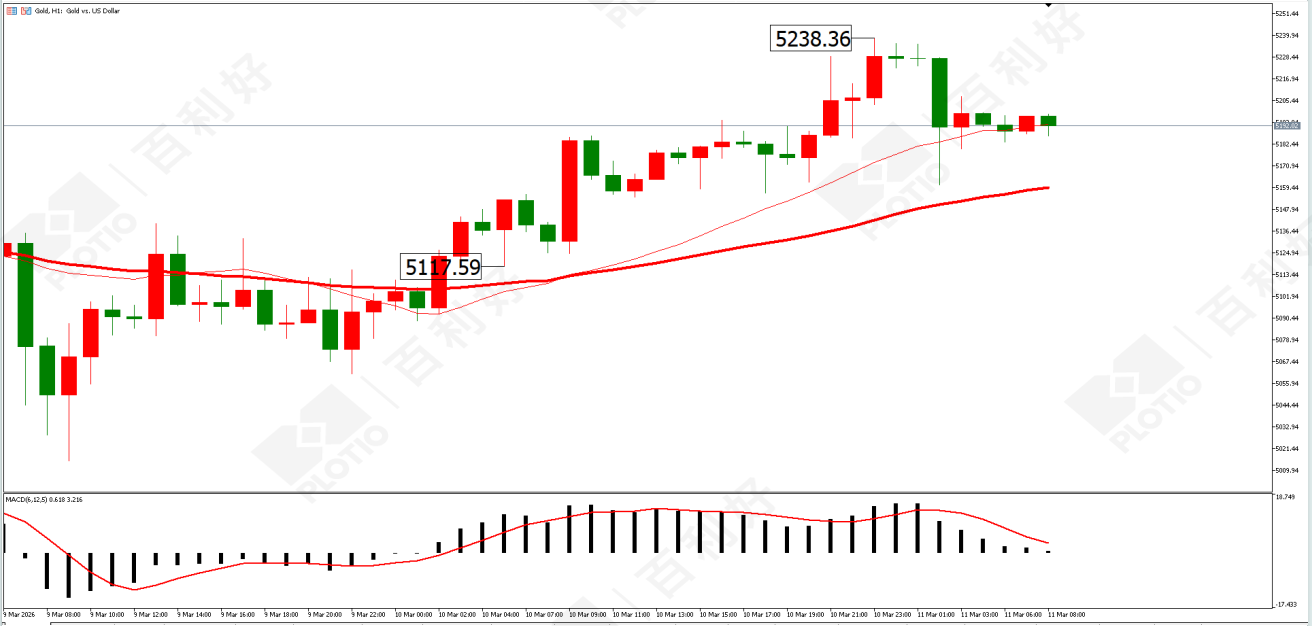 技术面:日线上,隔夜行情冲高回落且收阴线,警惕短期再度下行风险。4小时线上,行情有下破20日均线风险,短期偏弱。日内关注下方5080美元一线支撑。