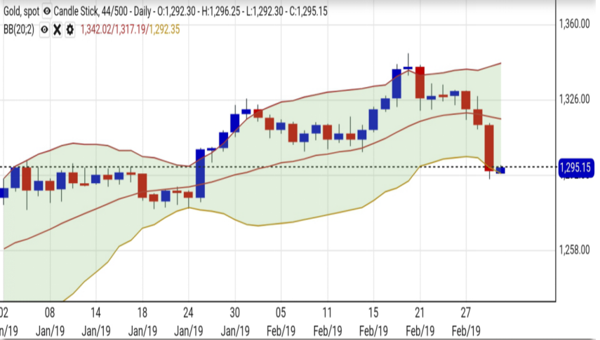 避险情绪回调下,美汇险守96.5水平,黄金一举跌破1300美元大关。现时金价已跌至日线图保力加通道的下轴,预期在1290至1295美元附近见支持。