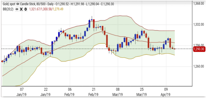 上周五美股急升避险情绪下降,加上中国公布的3月出口数据较预期佳上升14.2%,中美贸易谈判将进入最后一轮,市场憧憬有良好结果,避险资金流出金市及美汇,带动金价偏软。技术上,金价正于1290美元附近整固,美国近日公布的经济数据较预期好,引致美联储减息的可能性降低,虽然年内倾向不加息,但减息憧憬破灭或令美汇于96水平整固,限制金价反弹动力。