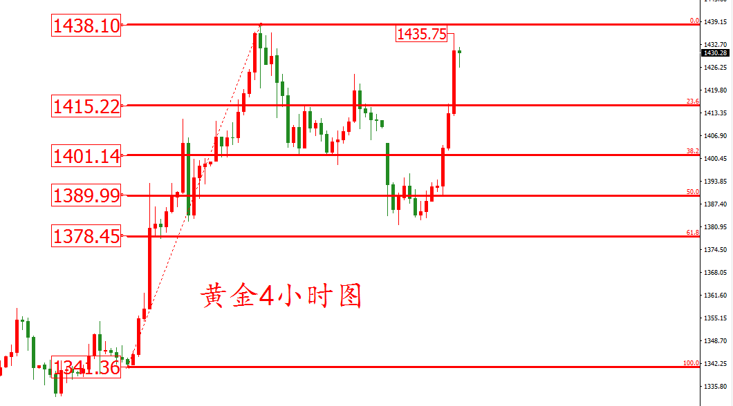 昨日由于全球贸易抑制经济增长和美联储未来降息的预期的影响,避险资产再次大受追捧,黄金晚间大幅上涨,日内波幅达40美金,多头表现强劲直指高点1438美元的位置。