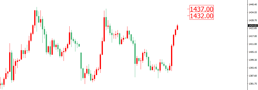 技术上黄金在昨日强势拉升上破此前4小时级别震荡区间中轨,目前价格直指上轨1432-37区间,此外ADX平均去向指标显示能聊线并未有强势抬头,预计接下来黄金短期将维持高位震荡的可能性较大,建议早间短线可继续多单看之1432附近,待价格测试1432-37区间考虑进空,止损1439,下看1422和1415.