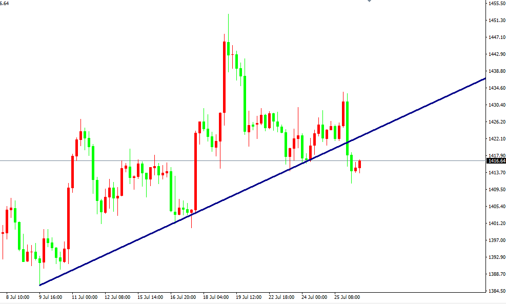 昨日,欧央行调整前瞻性指引,预计将保持现有关键利率水平不变或者更低水平至少至2020年上半年。发布会上德拉基表示没有就降息和降息规模作出讨论,但任何降息都应该用温和的措施。欧洲央行委员会一致同意在9月份加码刺激措施,但部分官员质疑重启QE的有效性。目前市场对欧央行重启QE有效性大打折扣,若接下来欧央行不能兑现承诺,期权市场将会给欧元汇率带来支撑。黄金受昨日德拉基影响,最终给出的方向,往下跌破1415,同时也给出信号,黄金和非美货币的春天将在下周一起出现,今晚们还需要重点关注,美将公布第二季度GDP数据,预计将会带给黄金一定的压力。所以从趋势性上来讲,建议投资者以逢低做多为主,下方我们需要关注的支撑位在1395附近。