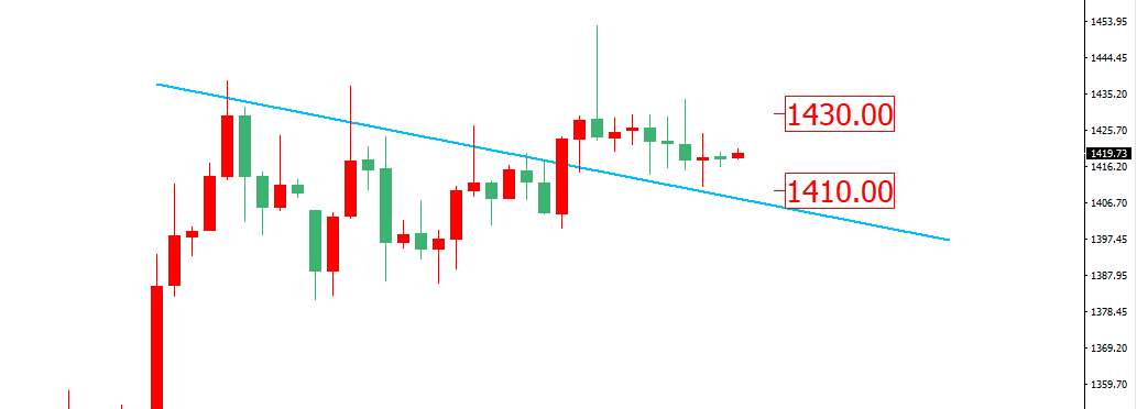 技术上当前黄金仍处于日线级别的前期震荡区间的破位之上,下方支撑在1410附近,但由于上一周金价屡次测试1430压力,体现该位置压力明显,建议日内仍以震荡思路在1410到1430区间进行高抛低吸。