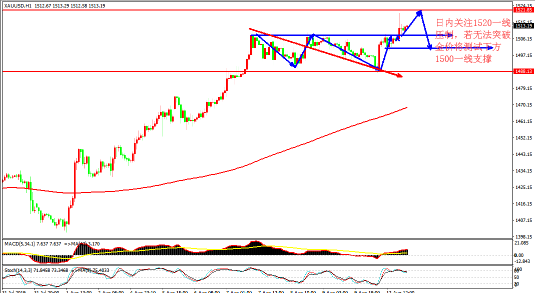 黄金技术面:金价凌晨创出六年新高1520美元一线,但受到上方套牢盘的出逃,以及周线的压制,使金价瞬间回到了1510下方。可以看出周线和月线上方压制点较为强劲,但不影响大的上涨格局。昨天跟大家提到时间修正和价格修正,金价小周期连续背离的情况下,价格始终没有出现深度回调。连续向下测试1490一线支撑,均未能有效下破,短期内形成有效双底,使多头再次发力,将价格一举推升至1520的高点。打破了此前1490-1510的区间,那幺我们在操作上可进行转换,将1495为防守点,在1500上方参与多头,目标依次看1510-1520。