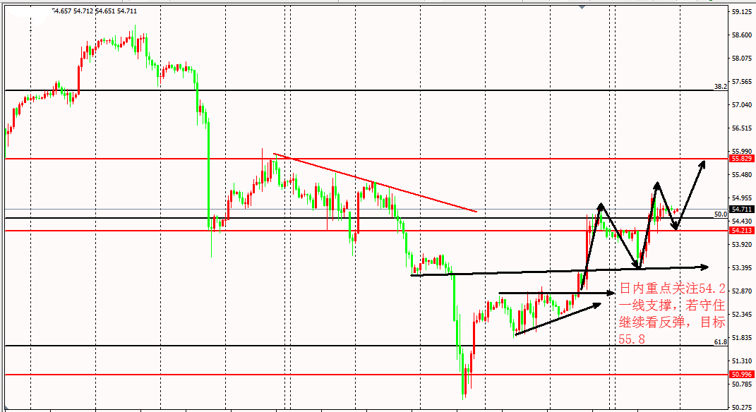 原油技术面:油价隔日走势基本符合预期,在53.6一线得以支撑后,价格迅速向上测试,最终触及55关口上方,足以说明前期空头获利了结,给多头动能喘气机会。油价在50.5一线得以支撑后,日线连续收出阳线,表明当前多头反弹动能强劲,不断的刷新高点。小时级别k线重新站上200日均线,预示后期反弹力度将加大,将测试前期k线整理密集区55.8一线,若价格第一次触及此位置,可轻仓短线开空一次,止损需带56.3附近,目标看54.6附近。油价后市若不能企稳在55.8上方,很大程度上将在53.3-55.8区间内整理,对上一轮下跌进行修正。