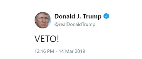3月15日凌晨,美国参议院表决,59票赞成,41票反对,推翻了特朗普的国家紧急状态法令。这是特朗普的命令第一次被国会参众两院否决。得知参议院表决结果后,特朗普第一时间发了一条推特,只有一个单词:VETO!(否决)。为了展示出他的情绪,特朗普还将四个字母全部用大写拼出以示强调,后边还加上了一个感叹号!