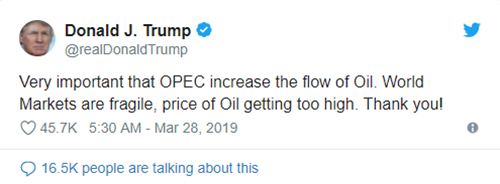 今年2月25日,特朗普就曾在推特上发布推文,称油价太高,欧佩克应努力降低价格。当日美布两油价格暴跌,但第二天均有不同程度反弹。
