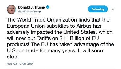 4月8日,美国贸易代表办公室发表声明中列举了可能对欧洲加征关税的商品清单,清单中包含空中客车飞机等一些民航产品,以及奶酪、葡萄酒等一系列非航空产品。声明预计称,欧盟对空客的补贴在贸易中对美国造成的伤害每年为110亿美元。