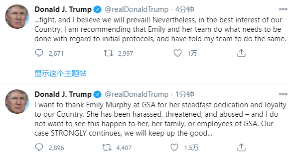 随后,特朗普在社交媒体上发文称:“我们的诉讼还在继续,我们会继续不懈努力。我相信我们会胜利!”但他随后又表示,尽管法律案件“仍在继续”,但他告诉美国总务管理局局长墨菲“要做一些有关初始协议的事情”。