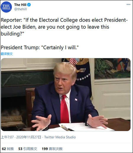 在当地时间26日,据美国哥伦比亚广播公司(CBS)报导,特朗普在被问及如果选举人团最终确认拜登获胜,他是否会承认大选结果时,特朗普表示,“如果他们这样做,那他们就犯了个错。”但随后被追问及他是否会因此离开白宫时,特朗普说:“我当然会(离开)。”