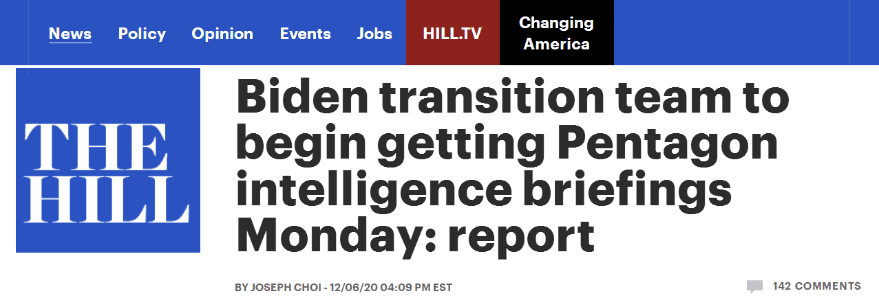 12月7日据美国《国会山》日报网站消息,美国国防部官员告诉美国有线电视新闻网(CNN),美国当选总统拜登的过渡团队成员将于当地时间周一(7日)开始接受来自五角大楼情报机构的简报。