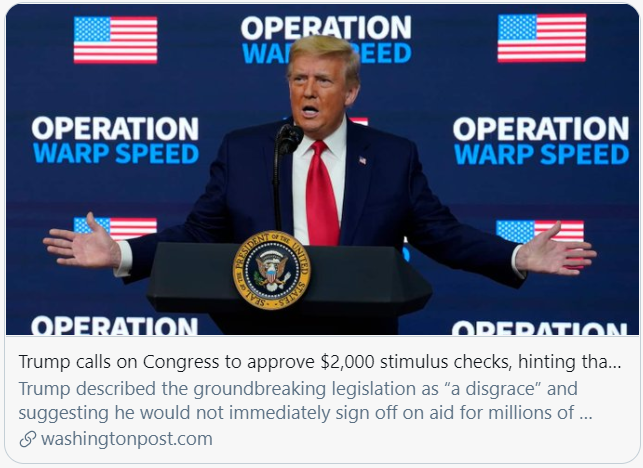 当地时间12月22日晚,特朗普在社交媒体上发布了一段视频,表达了对新冠疫情纾困法案的不满。