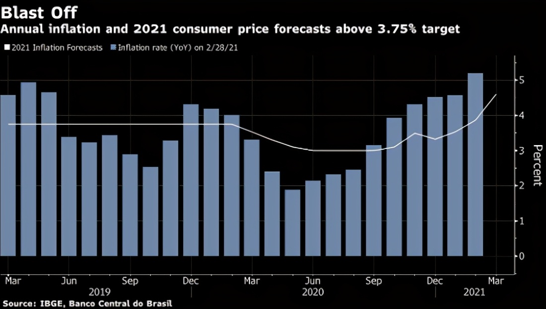 巴西进行了十多年来最大幅度的一次加息,并暗示下次会议再次加息,因决策者急于控制高于目标的通胀水平,尽管在新一波疫情冲击中经济呈疲软态势。