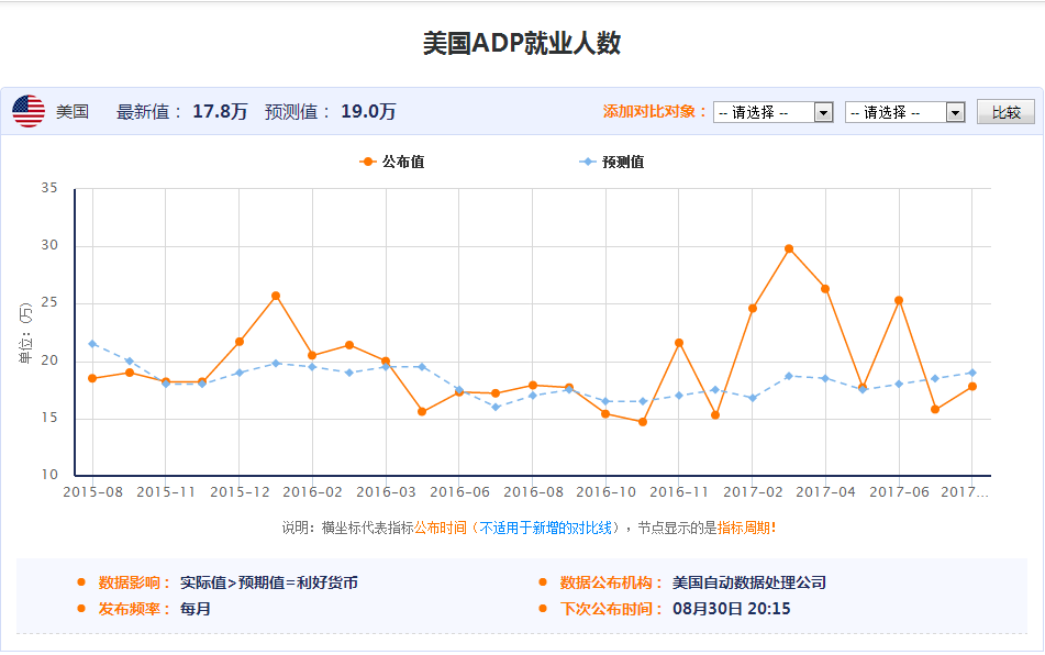 素有小非农之称的美国ADP就业人数在本周礼拜三公布,公布值17.8万小于预期19.0以及前值19.1。17.8万的公布值相对来看是2015年8月份以来相对的低点位置,与此前美联储FOMC会议中表态的美国就业市场的稳步增长态势较为符合。