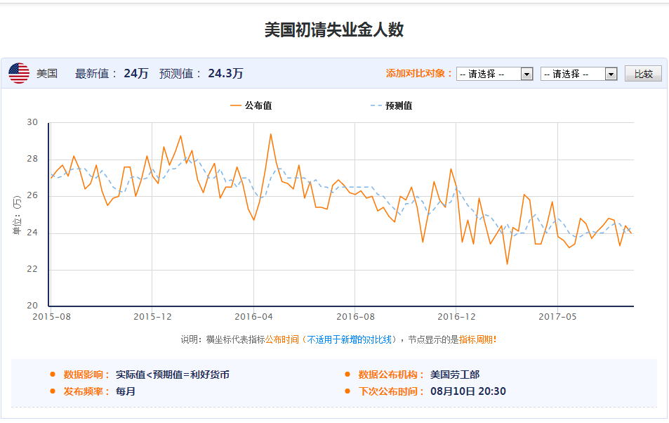 星期四(8月3日)美国当周初请失业金人数公布,公布值(24万)小于预期(24.3万)和前值(24.5万), 初请数据已连续长时间维持于关键的30万关口下方。当周初请失业金人数的减少,代表美国就业市场的闲置资源的到更好的有效利用,就业市场的好转催化美国经济内生增长的动力,有利于美国9月份缩表计划的进程。