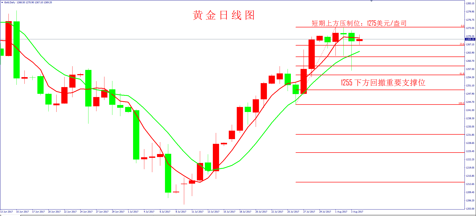 日线级别:黄金本周的持续来回过程,确认了本周上方压力位1275美元/盎司一线。结合之前的上涨波段,后面价格回落休整中关注1262美元/盎司和1255美元/盎司,重点看1255位置的支撑效果。