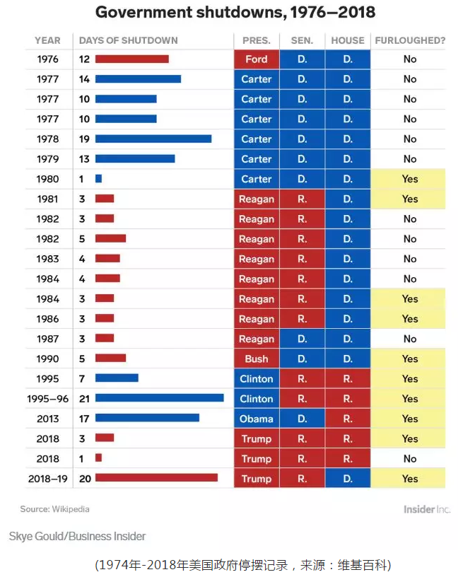 目前并没有人知道,到底美国政府的停摆会持续到什么时候,但是我们知道,持续的时间越长,对于美国经济复苏的伤害会越大。统计数据显示,自从1974年美国实行现代预算程序以来,这是第21次政府关门。仅在特朗普任期内,目前已经是第三次,前面两次分别停摆了1天和3天,影响相对有限,但是这一次特朗普希望国会拨款57亿美元,用于在美国和墨西哥边境修建边境墙,但是遭到了民主党把控的众议院的拒绝。于是自圣诞节到现在,美国政府处于停摆状态,创下了历史上最长关门记录。