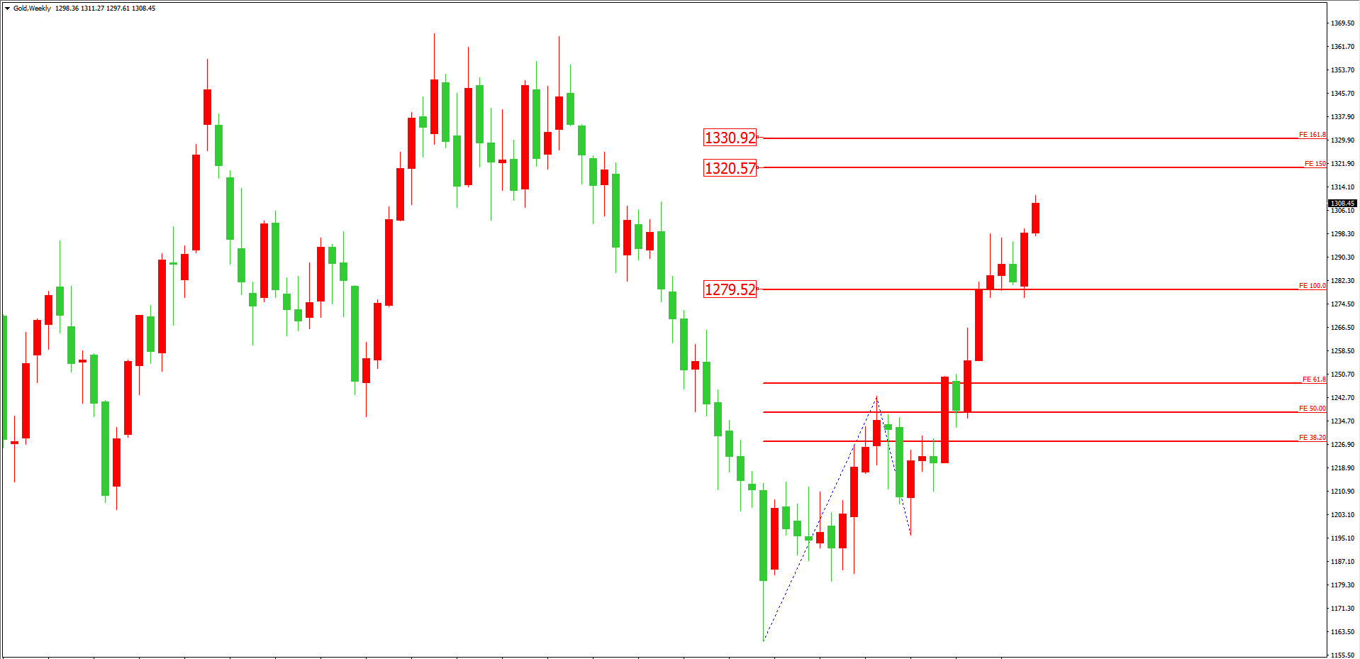 从黄金周线级别来看,行情至2018年8月12日止跌反弹以来,价格在10月份进行回落之后,由去年11月发起第二轮涨势,当中价格在突破前期涨幅100%位置(1280)之后,行情经过回踩并于上周五再度发动拉升,当前正处于冲击黄金拓展线150%和161.8%的过程当中,建议本周持续跟进黄金周期性多单,价格于1300附近可考虑进场,当然,若期间因数据行情造成回落,投资者可考虑在1295附近进行适当加仓,目标上看1320和1330。