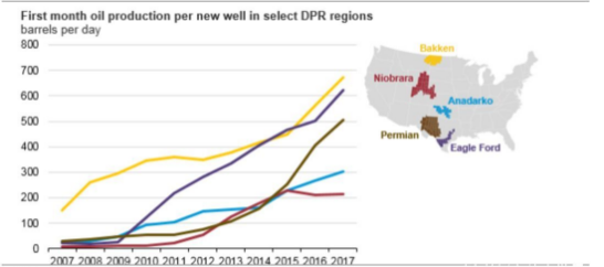 最后,因页岩油在美国原油产量中所占比重越来越大,故而更有效的钻井技术就成为影响美国原油产量的重中之重。以美国的二叠纪盆地为例,2017年新井的首月产量约为500桶/日,而2016年仅为400桶/日,2015年不及300桶/日,近两年初始生产率提高了50%以上,并依然保持上升趋势。在未来,相应的页岩油开采技术越发精进,钻井生产率提升的同时,本身的开采成本亦会因此下降,从而更大化的激发页岩油的开采力度以及开采量。