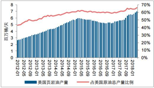 首先,2010年由于技术改进,美国页岩油产量大幅增长,2016年美国页岩油产量为424万桶/日,是全球最主要的页岩油开采国家。到2017年美国页岩油产量约为470万桶/日,近10年复合增速27%。2018年以来随着油价上涨,美国页岩油开采活跃,上半年页岩油平均日产量约为569万桶,同比增加127万桶/日(+28.7%),占国内原油总产量的54.8%。