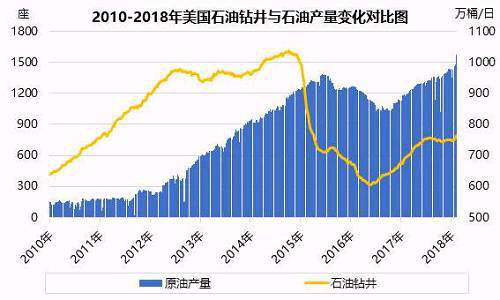 图示:2010-2018美国石油钻井与石油产量变化图对比