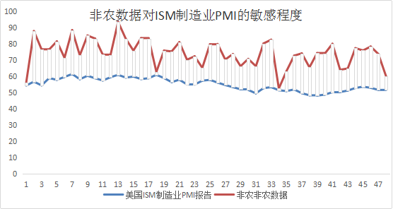 其次我们关注到美国ISM制造业PMI数据,该数据反映美国经济繁荣度,是经济健康与否的先行指标(先行性表现在其透露的信息先于其他数据比如非农以及CPI),商业市场能迅速对市场条件作出反应,此次公布数据大大好于市场预期。周一晚间公布美国3月份ISM制造业PMI数据为55.3,好于市场预期54.5以及前值54.2,表明美国制造业强劲,并没有想象中那么差;更重要的是我们从下图中可以看到非农数据对于ISM制造业PMI数据非常敏感,而本周公布ISM制造业PMI数据大大好于预期,所以我们可以大胆的预测本周非农或将给我们新惊喜。