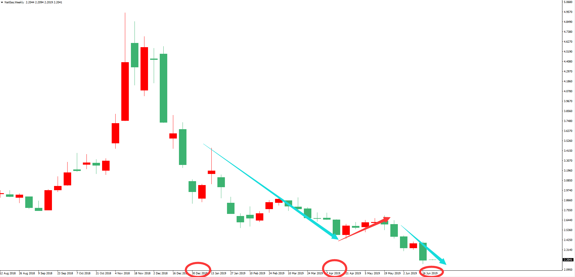 从天然气和石油的2019年以来的行情走势可以发现两者历史上的价格联动性正在逐渐消失,两者的行情走势在进一步分离。2019年初至2019年四月底原油价格一路上行,而天然气在此期间较为弱势一路下行;在四月底至六月初原油价格一路下行,而天然气在此期间较为坚挺;最后在六月中旬至今油价开始走强,而天然气则进一步走弱并创新低,可见天然气运用技术水平的提升,天然气和石油的替代关系正在左右天然气未来走势。