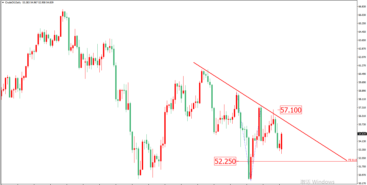 所以总体来说,当前油市充斥着诸多不确定因素,多空暂时难以决出高下,接下来我们需密切关注市场对于经济下行程度的评估以及减产方面的变化,同时结合技术面判断市场情绪在关键区域的抉择。技术面上看,原油本月上旬的下跌走势为尝试打开结构形空头区间的第一步,但该段走势并未对50.5附近支撑成功破位,随之价格呈现了半月之久的反弹之后于上周再次下跌延续第二步的测试,下方多空关键转换点于52.25附近。操作上建议价格在测试52.25之前,只要行情不直接上破57.1美元(破位建议追多),整体仍以高空思路进行,待价格测试52.25附近之后关注支撑或破位情况进行跟进,上方压力58.5-60美元,下方支撑50.5-49美元。