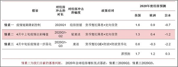 图示:不同情景下美国、欧洲、日本经济增长预测